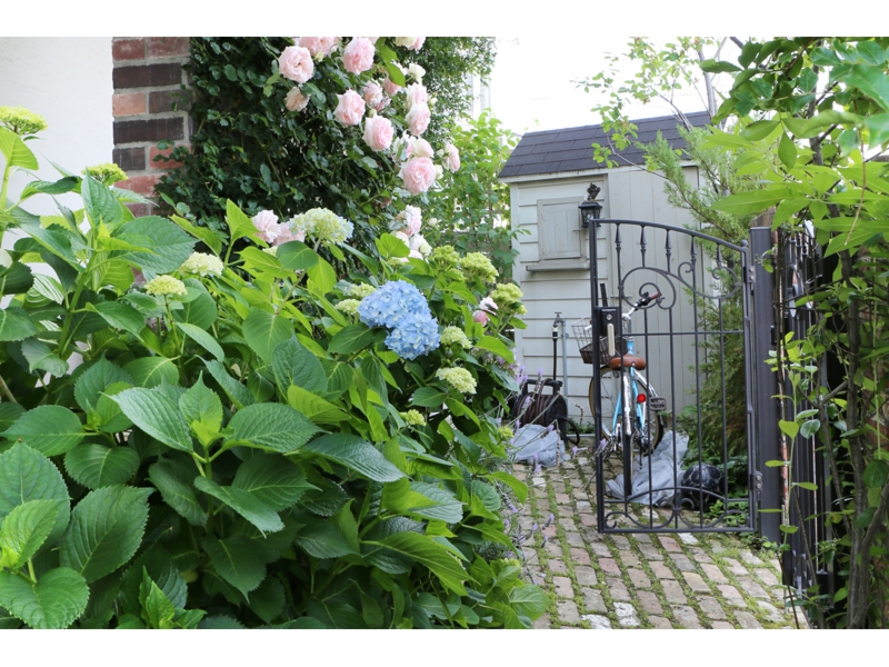 床は砂利舗装にし、周囲の花壇部分は、窓前のポーチに合わせ水はけの改善と間仕切りを兼ね、乱形石を積んでいます。