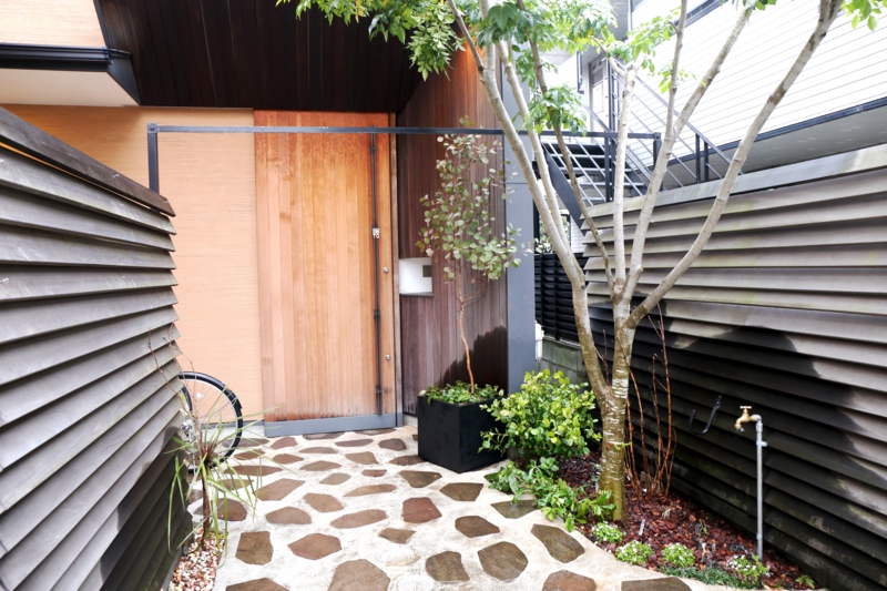 リビングに面した中庭にアンティークのイスやテーブル、コンテナを植物と共にコーディネイトしています。元々植えられていたインパクトの強いソテツと背景のウッドフェンスに合わせ、落ち着いた印象のアイテムやグリーンを選んでいます。