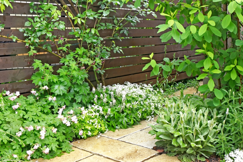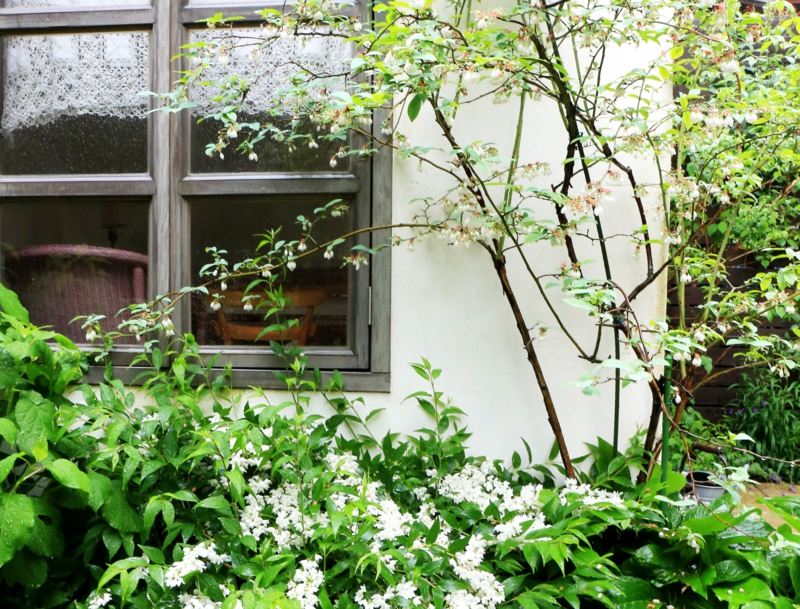 お嬢さんが楽しめるガーデンハウスと目隠しフェンスの設置を最初に行い、5年後、ウッドデッキの老朽化に合わせ、デッキの改修と舗装工事を行いました。庭のメインのポイントになっている小屋の中は、漆喰の壁に、床はフローリング材を張り、「離れ」のような空間になっています。高さのあるフェンスにはツルバラを誘引し、足元にはヒメウツギやフウロソウなどの下草を配しています。リビングダイニングに面した広いデッキには、テーブルとイスを置き、日除けになるよう設けたパーゴラにはブドウを絡めています。