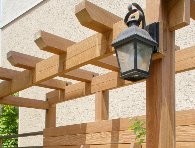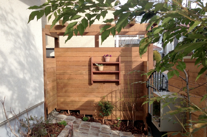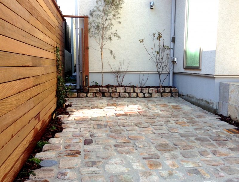 道路に面したエントランスと駐車場を、玄関扉に合わせた色合いのイペ材を使用して、フェンスや機能門柱をつくりました。ゲートはロートアイアンで製作し、床は通常よりも大きなレンガを敷き詰め、明るい目地材で仕上げました。ポーチの目隠しに株立のシマトネリコやジューンべリー、フェンスにはアイビーやクレマチスを誘引し、イペ材の経年変化と共にグリーンが増え、より柔らかい印象になっていきます。