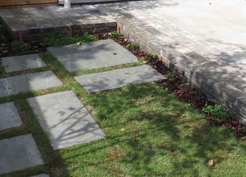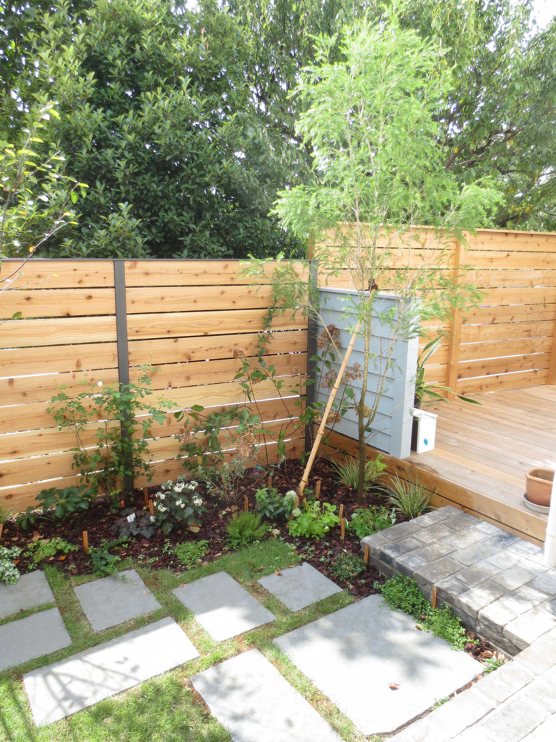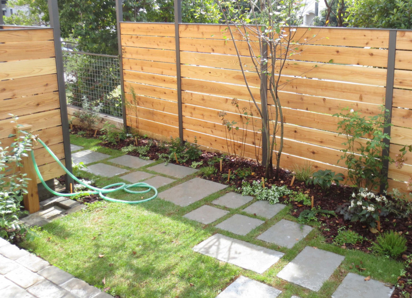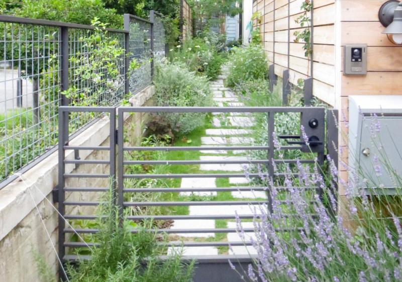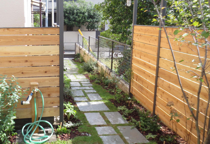 新築のお宅。道路から玄関まで約13mある長いアプローチを楽しみながら歩けるよう色々な植物を植えました。アプローチの片方はアパート、もう片方は公園なので、アパート側は目隠しフェンスを設置し、公園側は公園の緑が美しいのでオリジナルのメッシュフェンスにしてさらに緑が楽しめるように工夫。門扉はオリジナルでスチールで作りました。