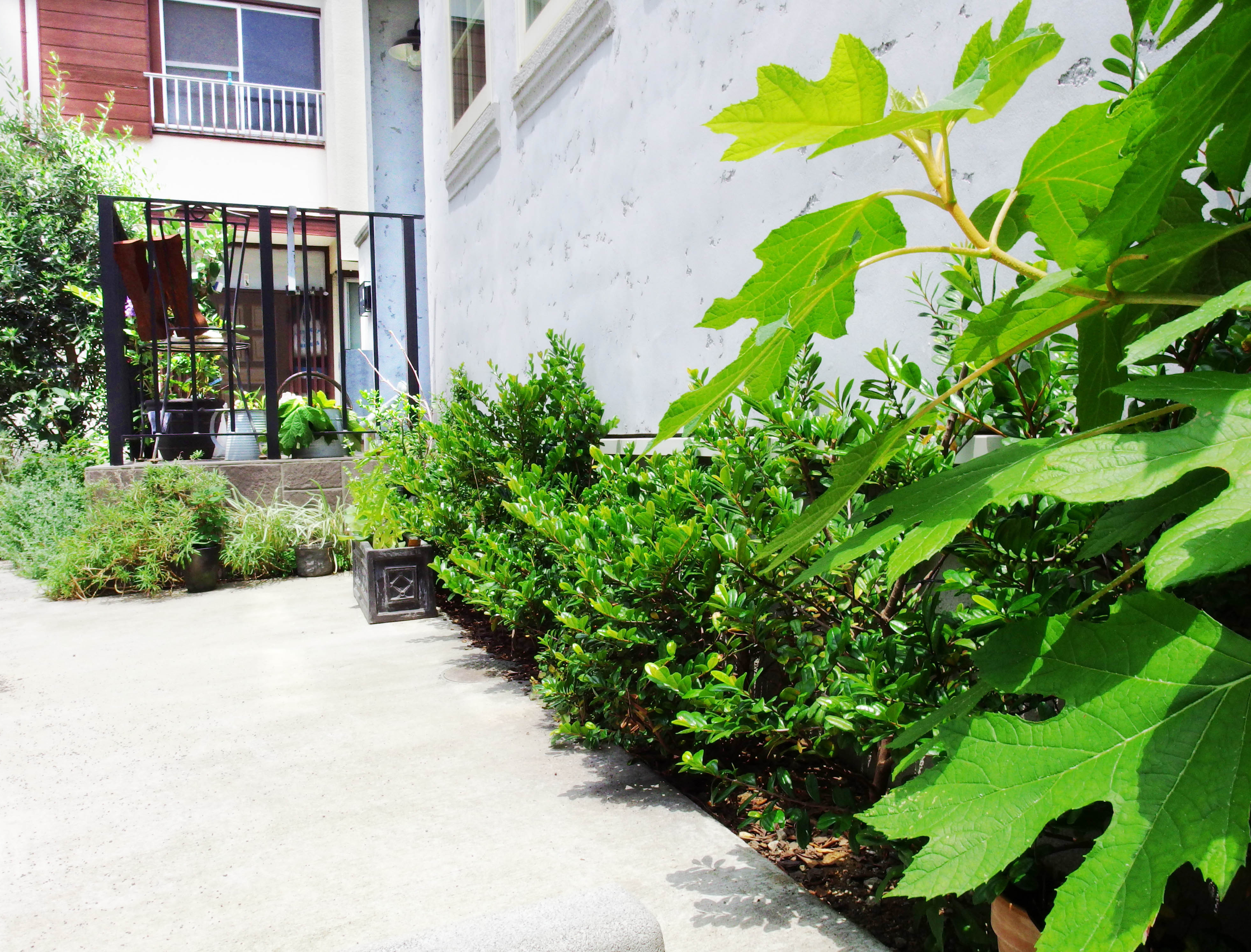 グレーと白でまとめたポーチ脇には、風合いのある質感の左官で仕上げた門柱を設置し、サインを兼ねたインターホンカバーはオリジナルで製作しました。黒に近いグレーで塗装した隣家との境界に建てた木製フェンスには、ブラックベリーがたわわに実っています。建物の基礎を隠すためにハマヒサカキ、ポーチ脇には道路からの目隠しのために、オリーブを植えています。