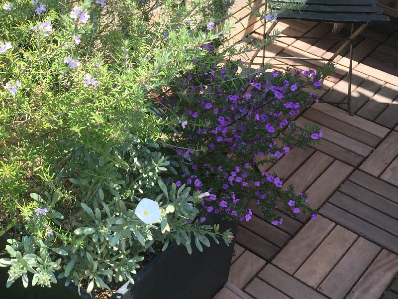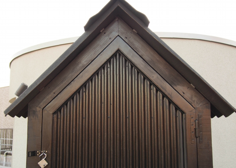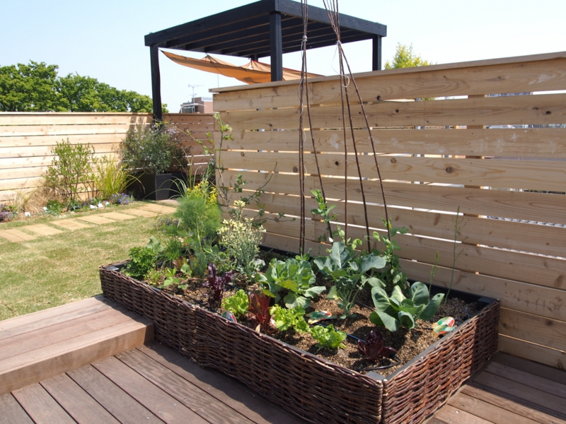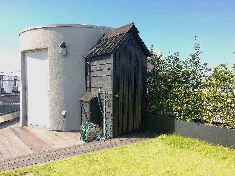 季節が楽しめる草花も植栽した。菜園はちょっとした土壌であるがハーブや葉物なら十分な収穫も可能。小屋には芝刈り機や掃除道具、チェア等の収納の他潅水装置を内部に納めてある。また屋上緑化は下のフロアの遮熱させる効果もある。