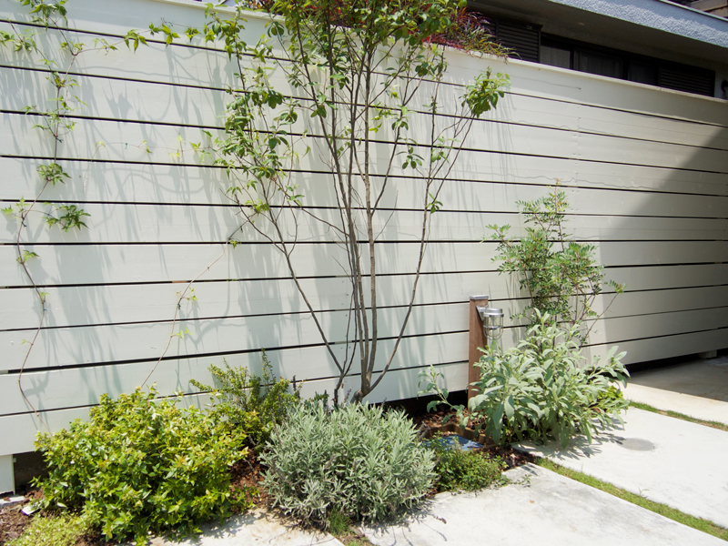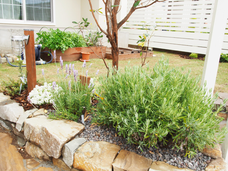 玄関までのアプローチ沿いにはローズマリーやラベンダーなどのハーブを配置し香りなどの感覚も楽しんで頂けます。