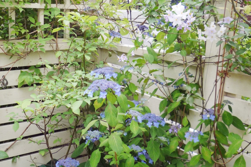 掃き出し窓の上部にもパーゴラを設置し、ツルハナナスやバラ、クレマチスを格子状のフェンスに旺盛に伸びています。