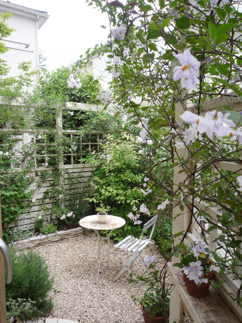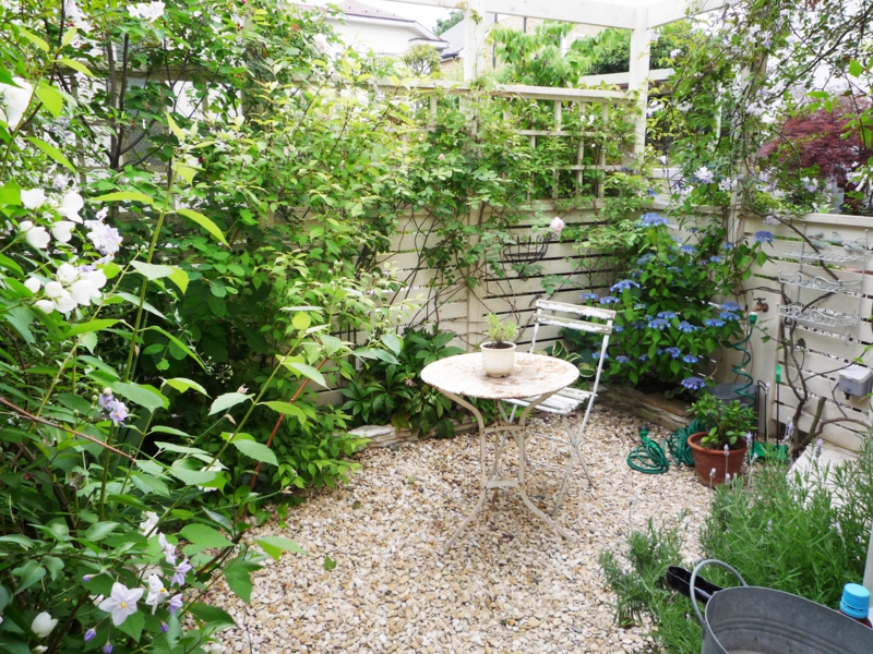 隣家に囲まれた8畳程の中庭。周囲を囲ったフェンスとパーゴラに、植物を絡ますことで、目隠しと植物のボリューム感を生む造りにしました。