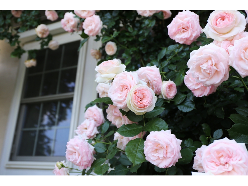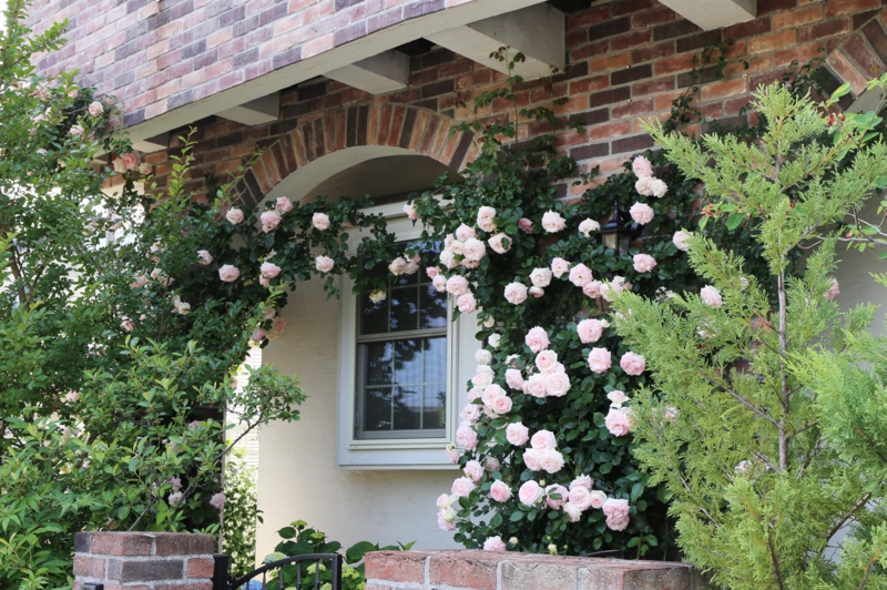 掃き出し窓の上部にもパーゴラを設置し、ツルハナナスやバラ、クレマチスを格子状のフェンスに旺盛に伸びています。