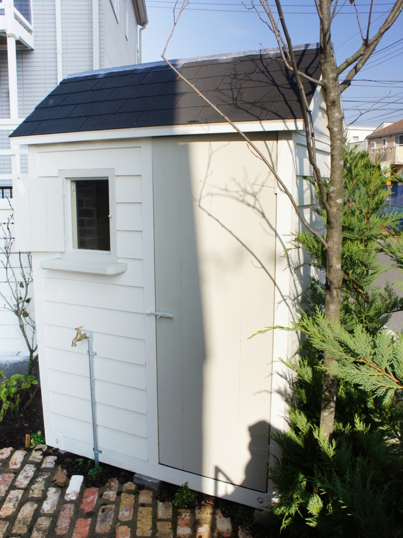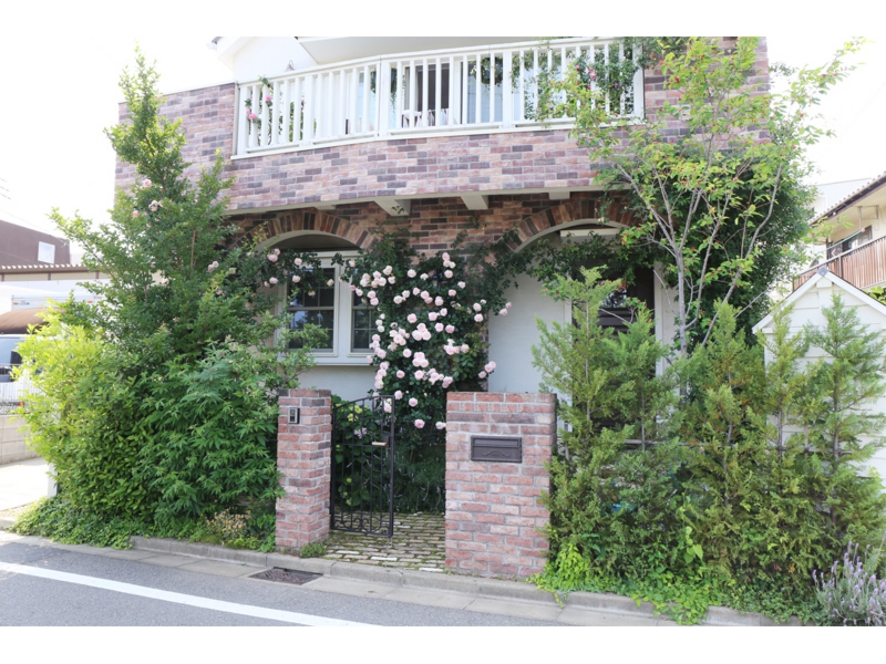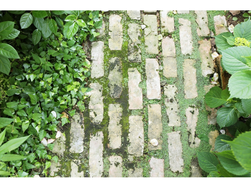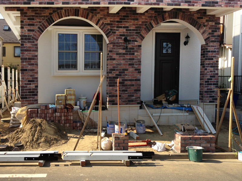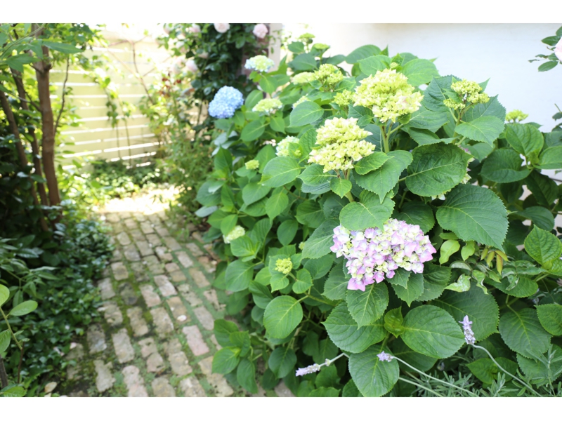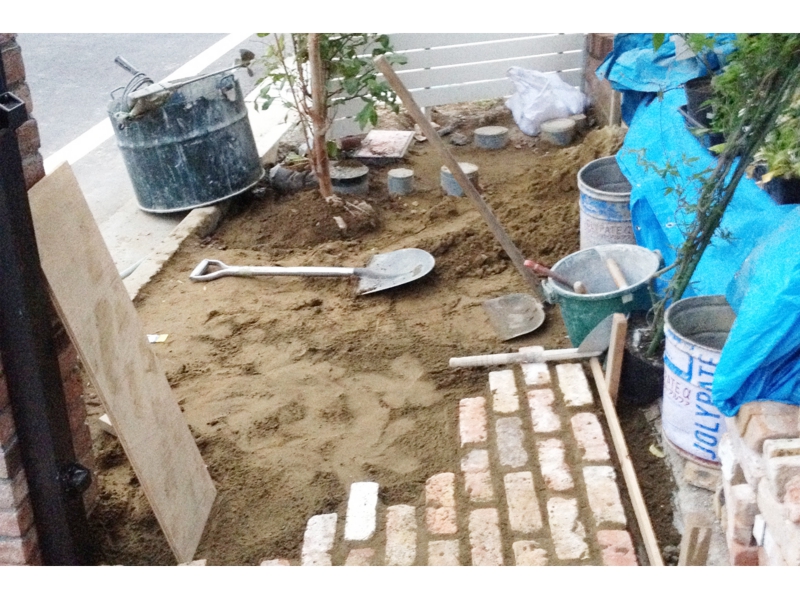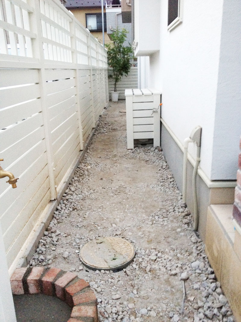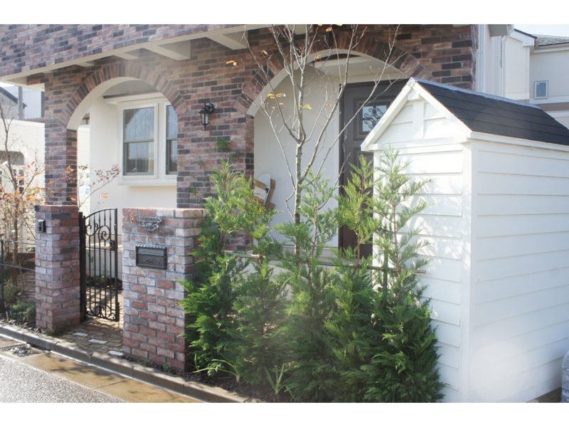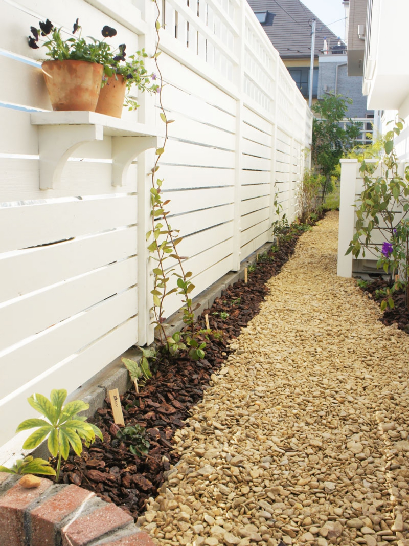 床は砂利舗装にし、周囲の花壇部分は、窓前のポーチに合わせ水はけの改善と間仕切りを兼ね、乱形石を積んでいます。