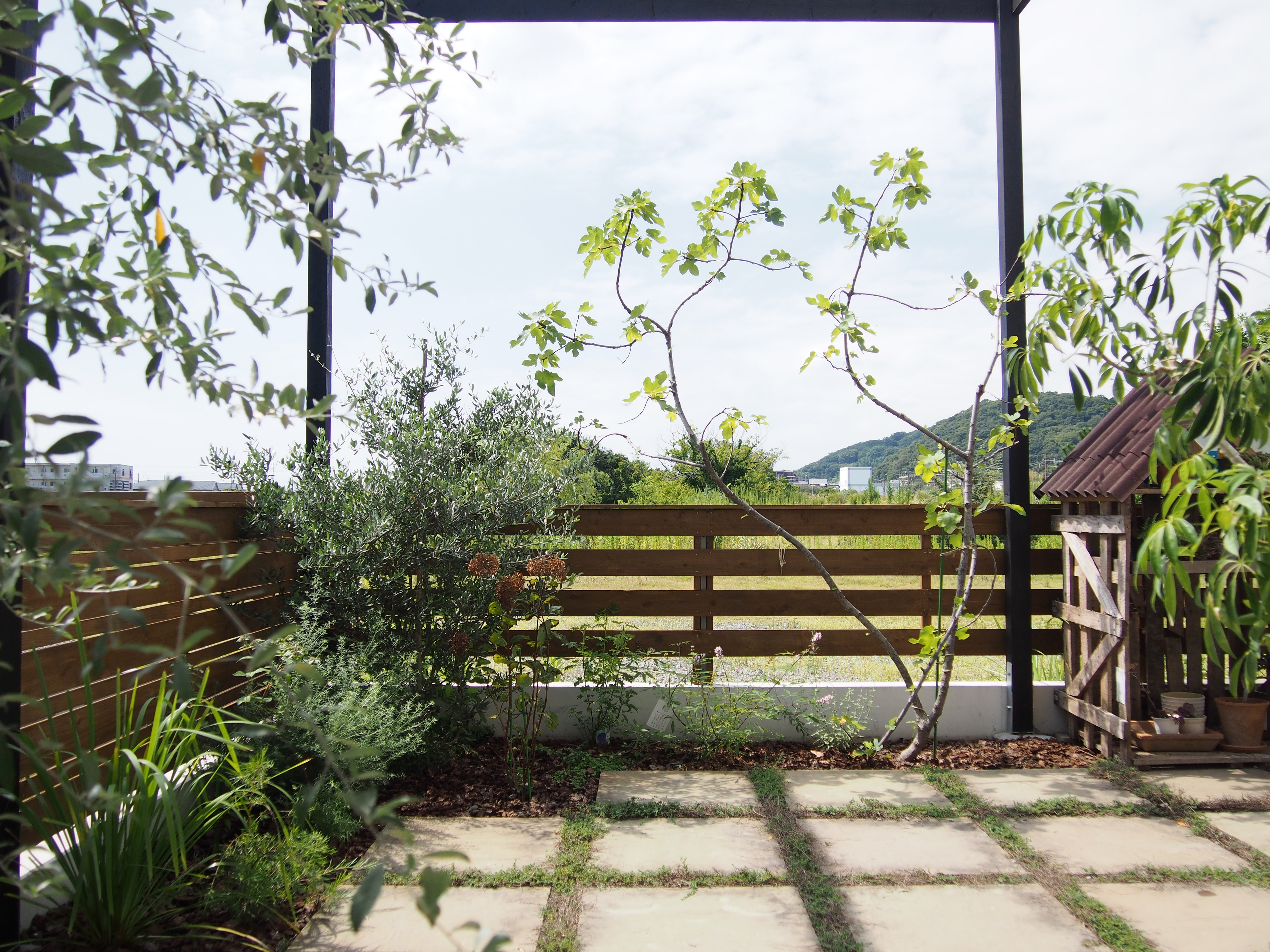 パーゴラはシンプルな構造ながら、黒塗装にしたことにより、青空と良い対比を出し、風景を切り取るようなフレームとなった。パーゴラには藤が絡ませてあり、藤が垂れ咲く日が待ち遠しい。
