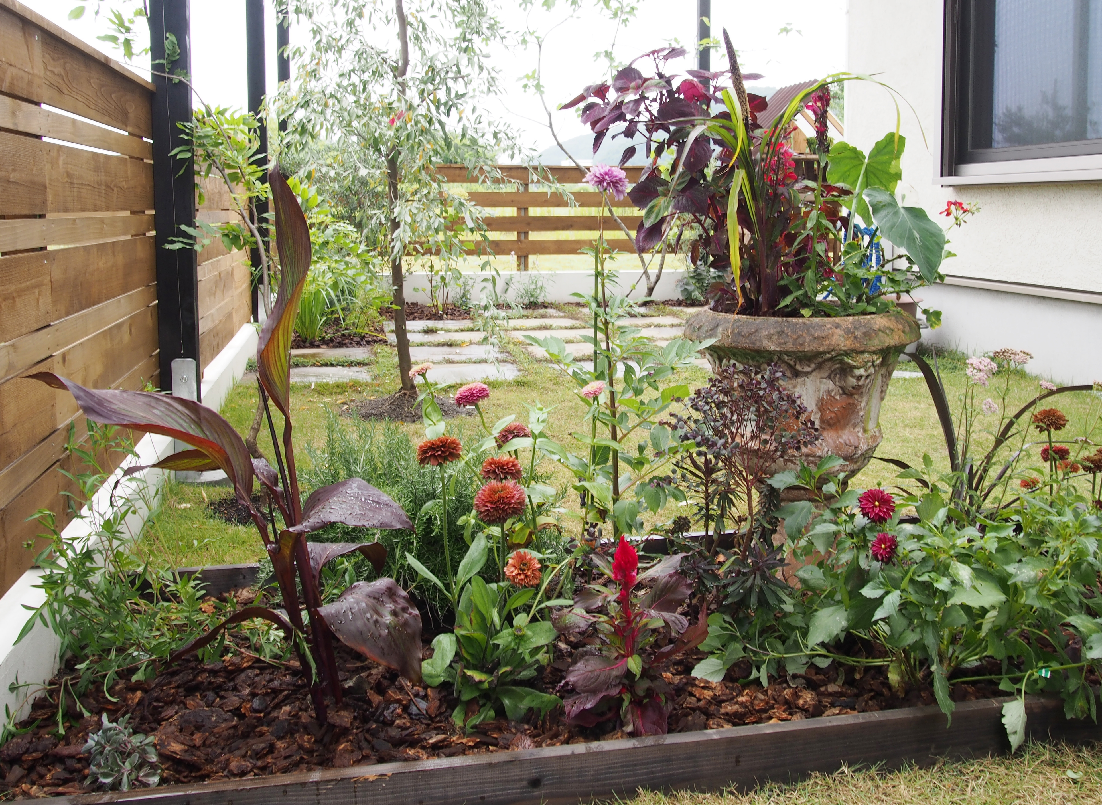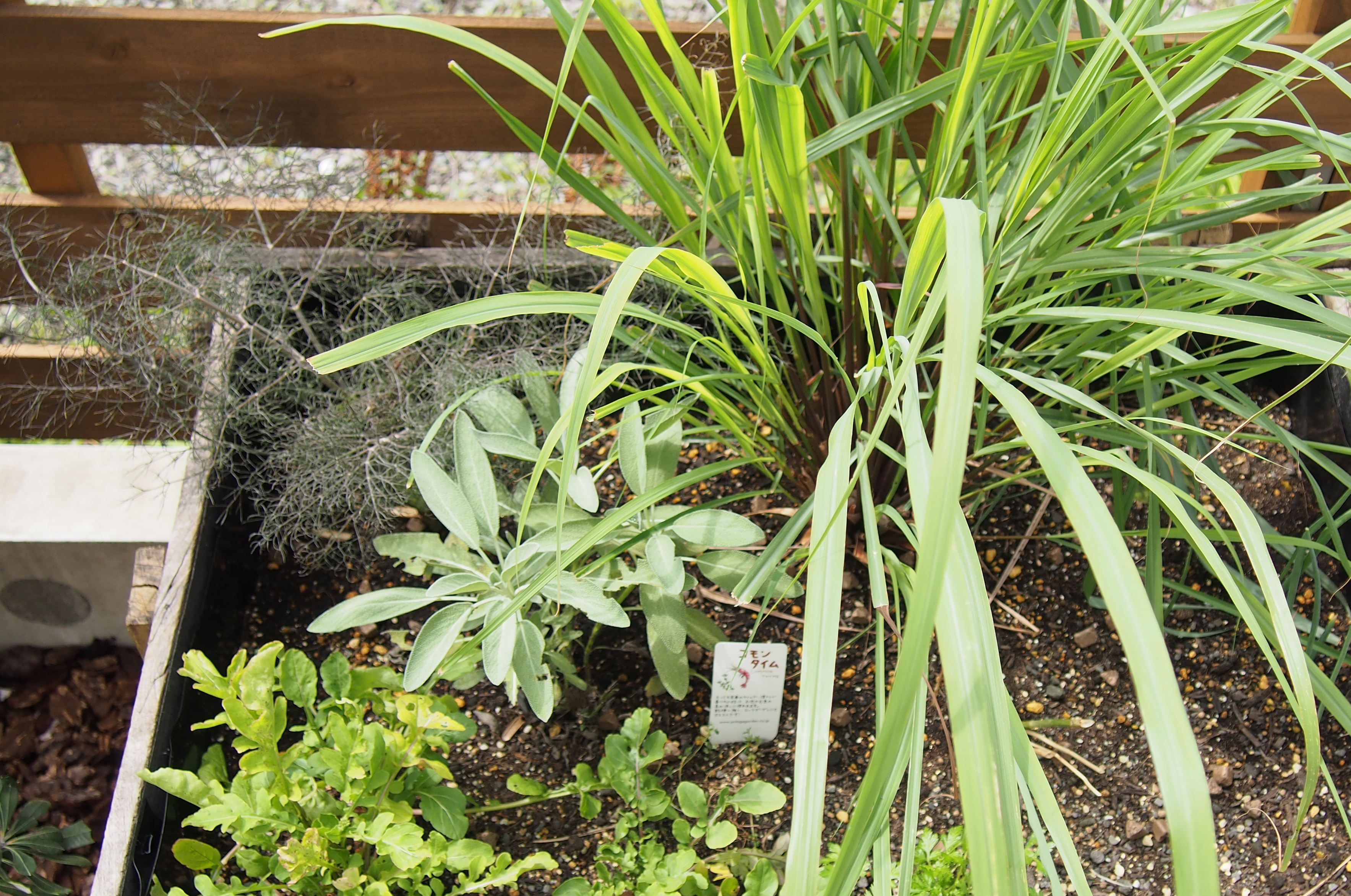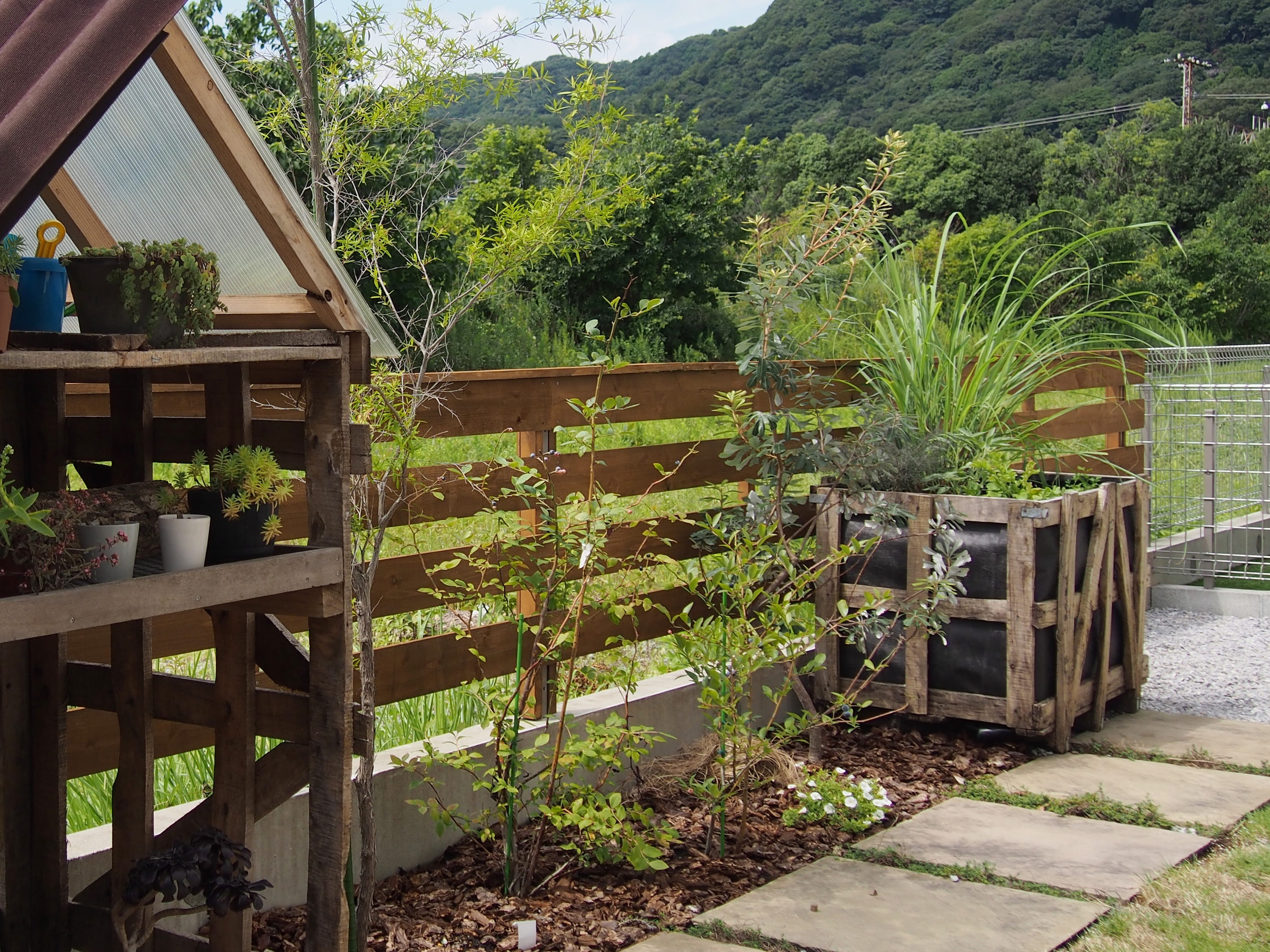 奥の空間には菜園コーナーがある、飾り棚とコンテナ(ともに廃材利用)、がアクセントに。植栽は藤とすこしノスタルジックな色調の植栽、ロシアンオリーブがシンボルツリー。