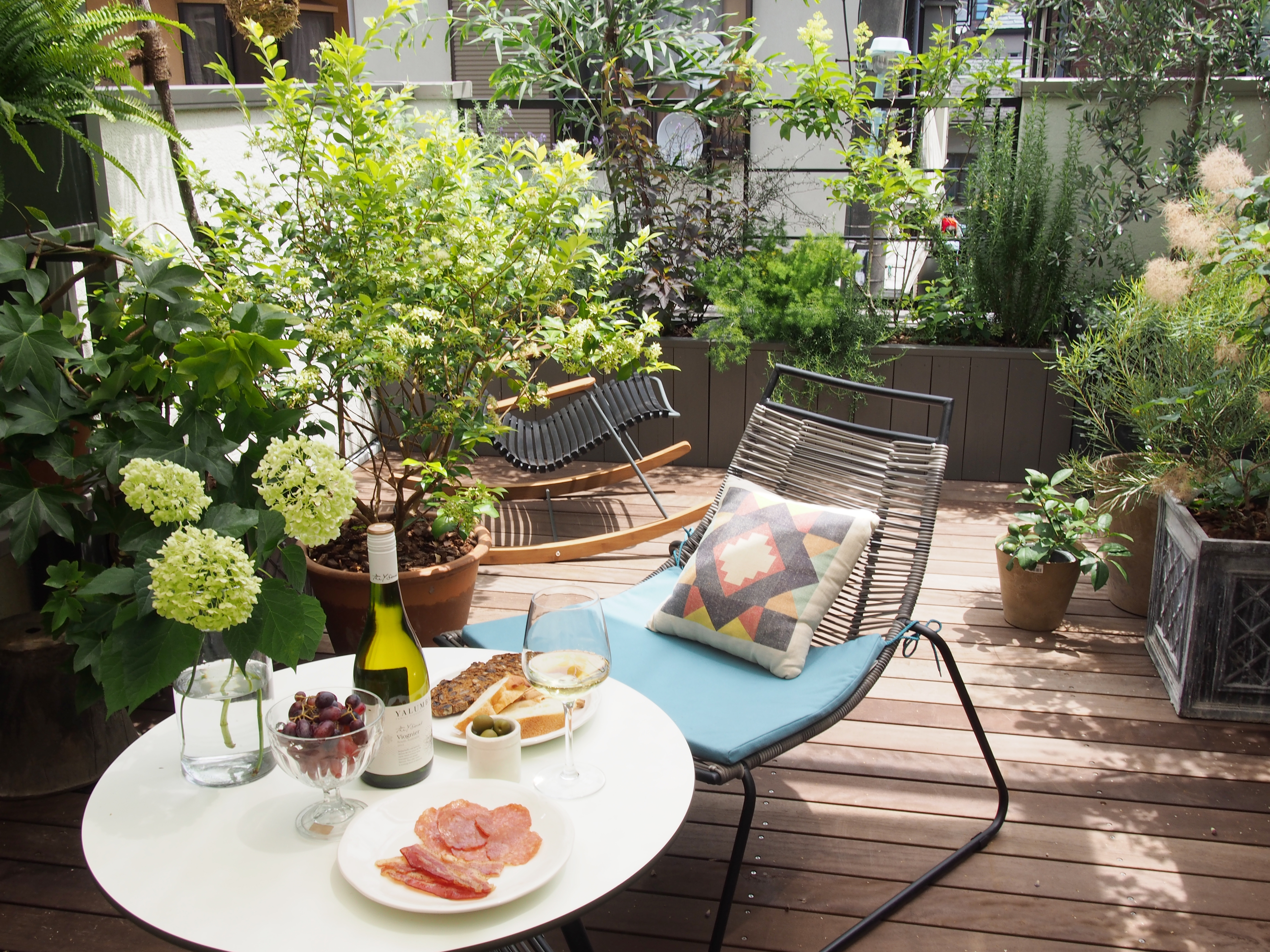 2Fリビングにつながる15㎡程のテラス。傷んでいたデッキは張替えリビングから隣地が抜ける景色に造作プランター、立体的にプランターを棚に設置し、植物で囲われた緑あふれる空間になった。