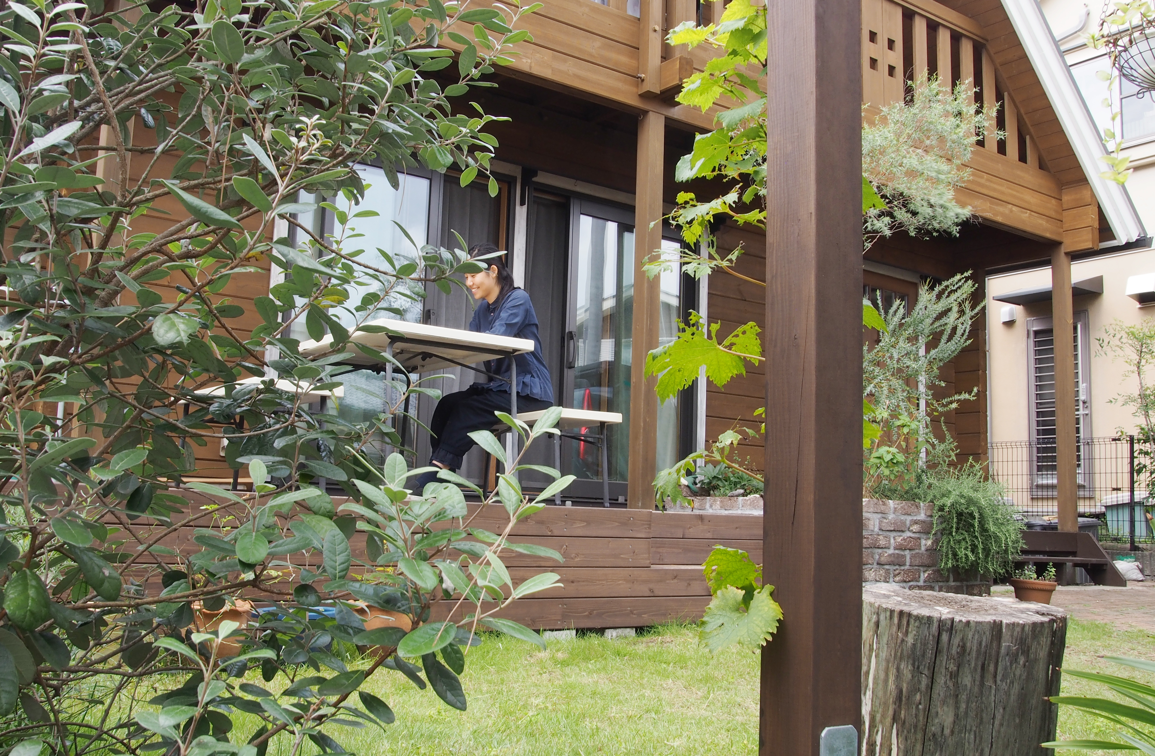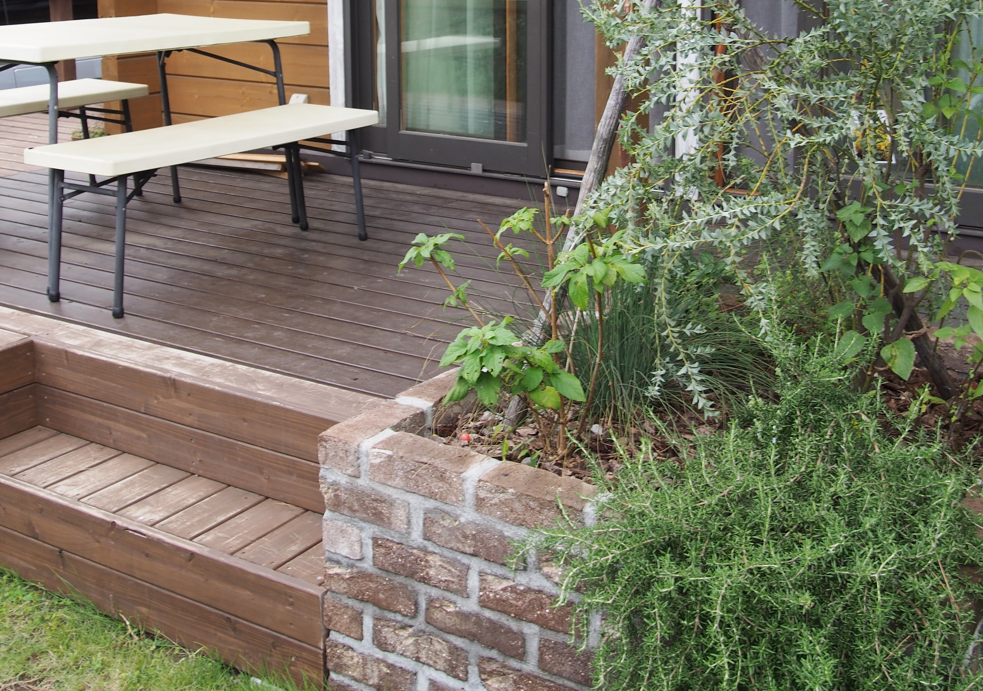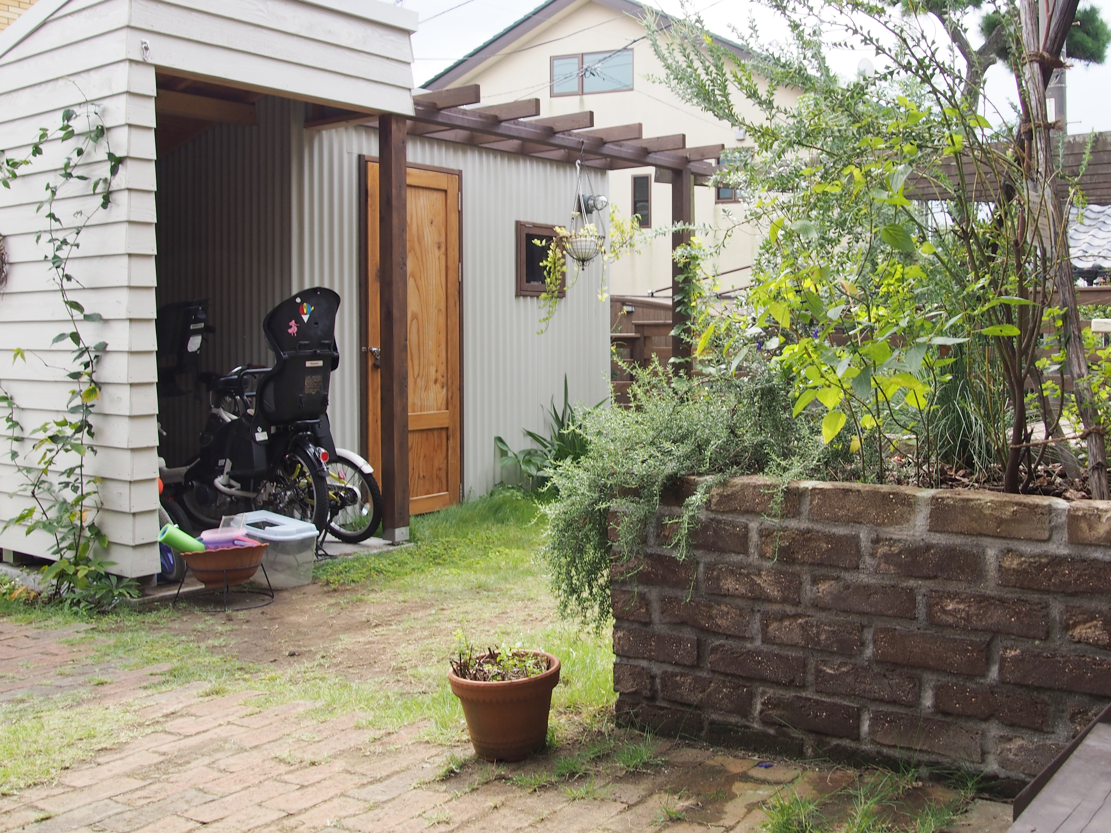 外周を覆うように、駐輪・小屋を配置し視線をカバーしくつろげるスペースが生まれた。デッキにてお茶を愉しんだり、夏にはプールを広げたり子どもたちの良い遊び場にもなっている。