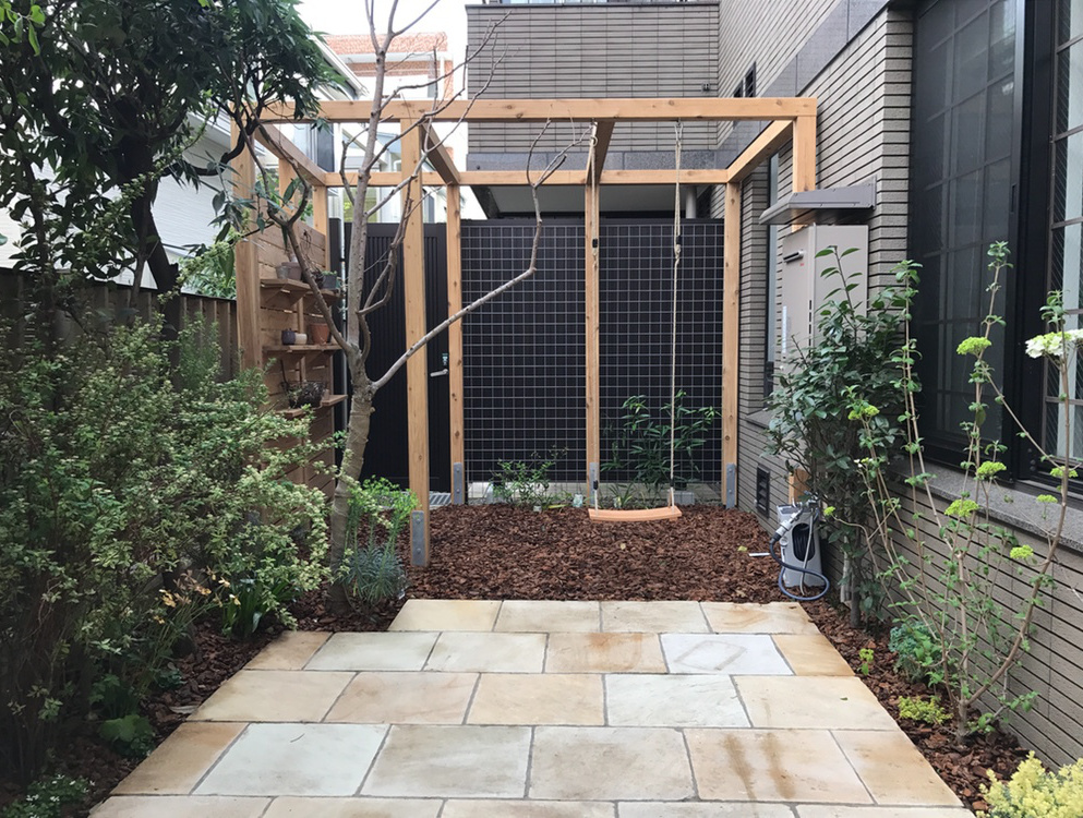 それに対し、[Patio]は、広々とした舗装とタープや菜園、ブランコを設置し、子供が自由に遊べるスペースに。
