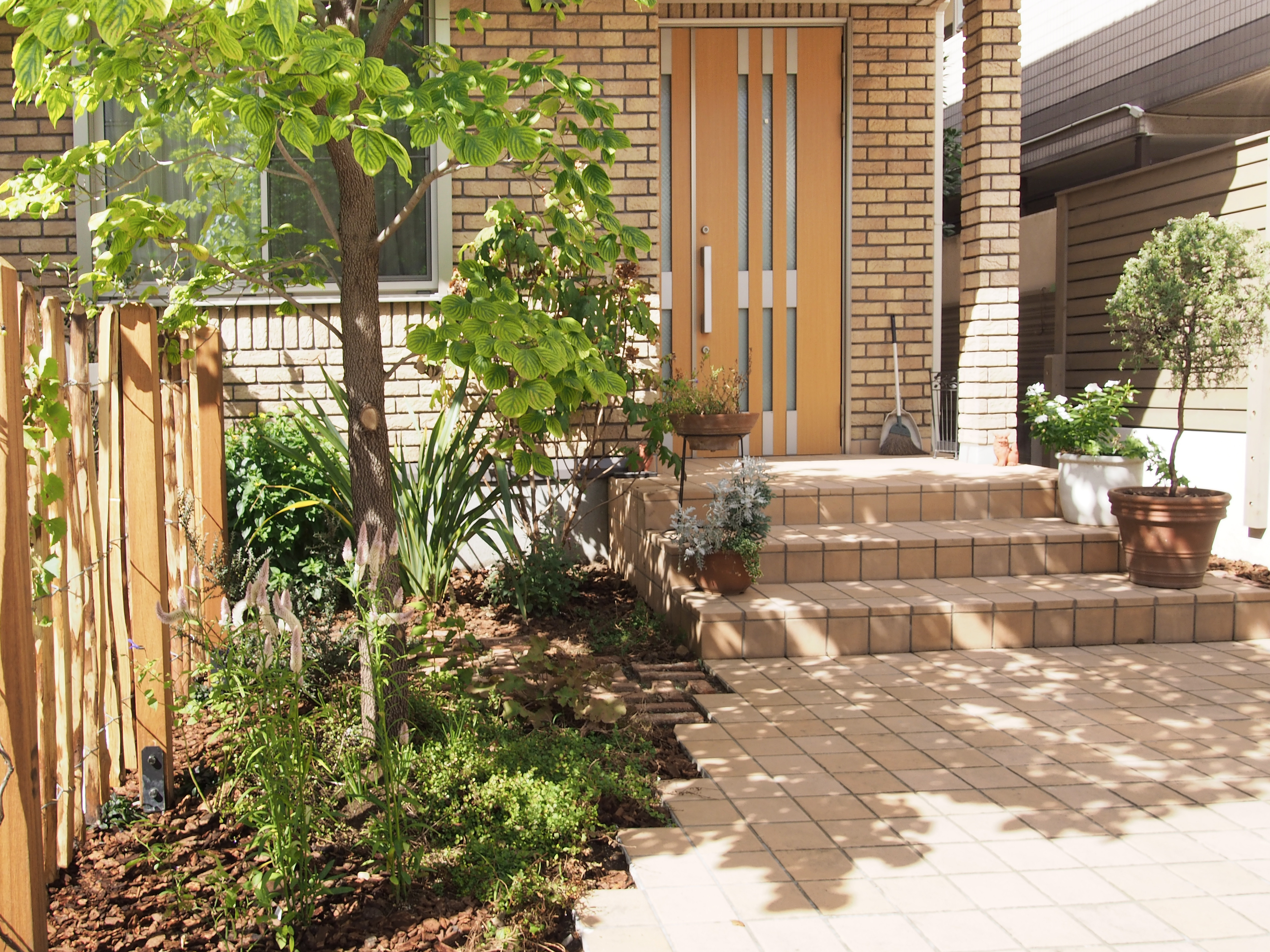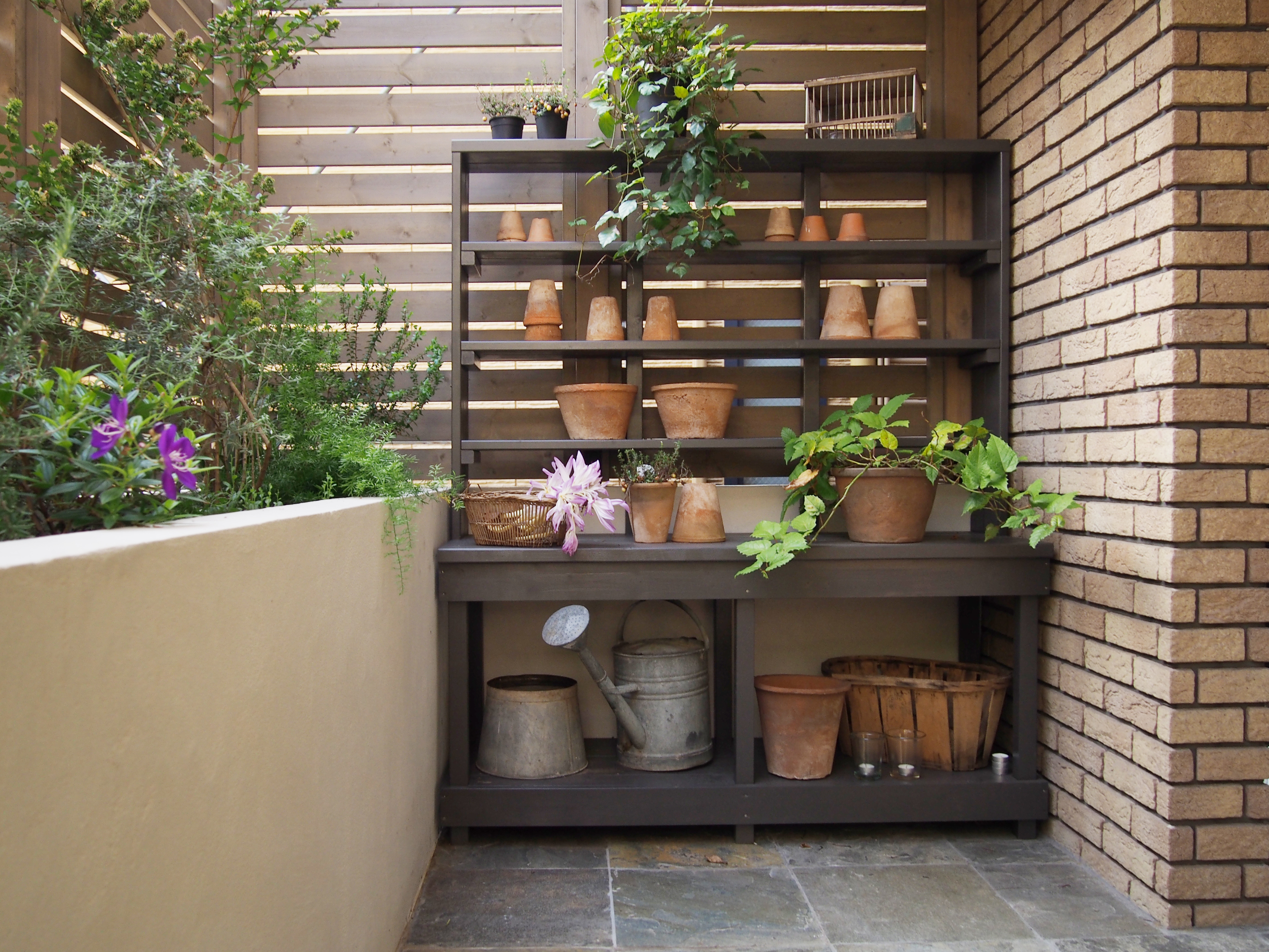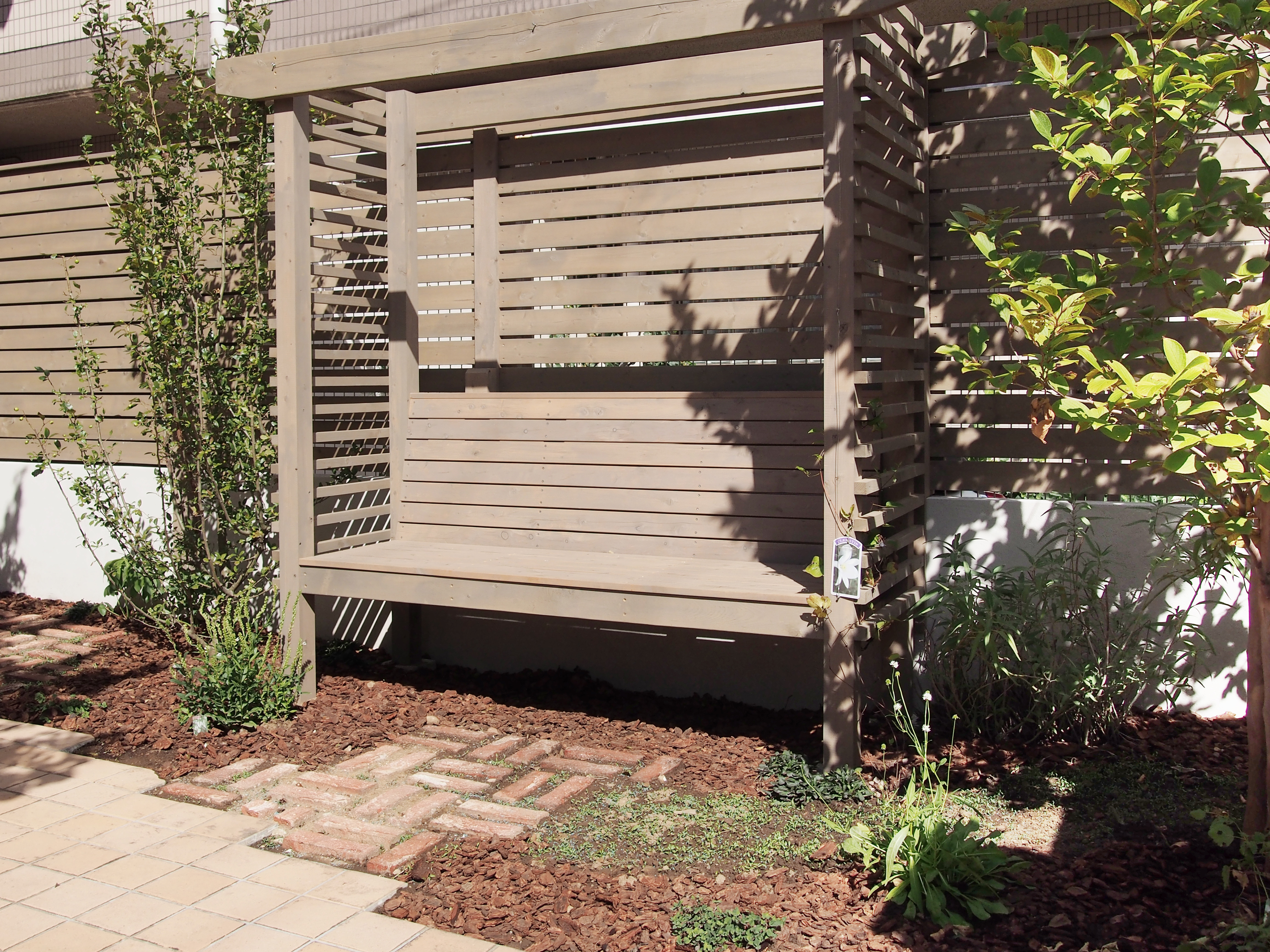 (プランター壁、パーゴラ、石敷き、造作飾り棚)